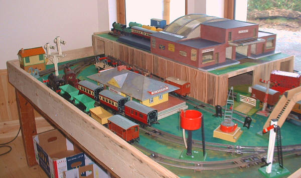 We are greatly indebted to Graeme Orr of Edinburgh for the amazing collection of locomotives , carriages , trucks , buildings and track . His own toys from his childhood . Part of which is shown above . Lots and lots of track and other goodies not shown . Hornby O gauge clockwork